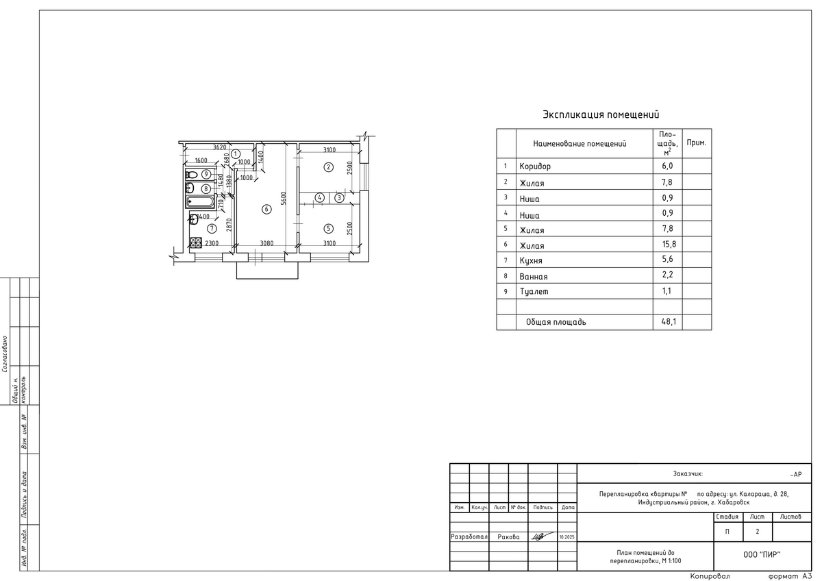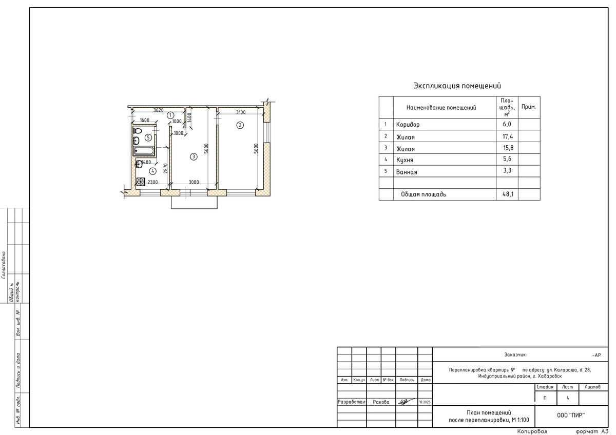 Задача: разработка проектной документации перепланировки 3-комнатной квартиры в Индустриальном районе города Хабаровска.