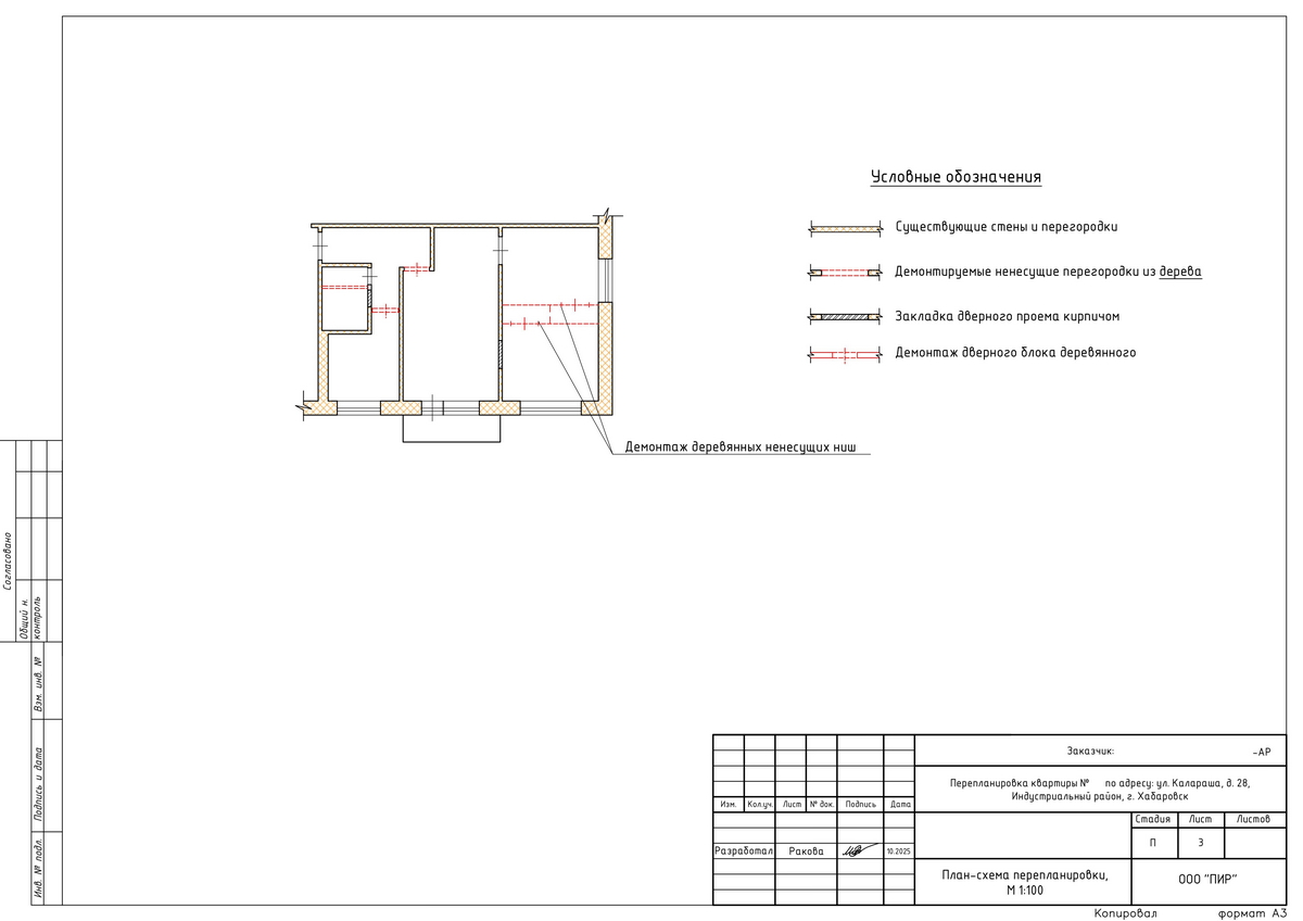 Выполненные работы: разработка архитектурно-планировочных решений, подготовка проектной документации для согласования перепланировки, в установленном законом порядке.
