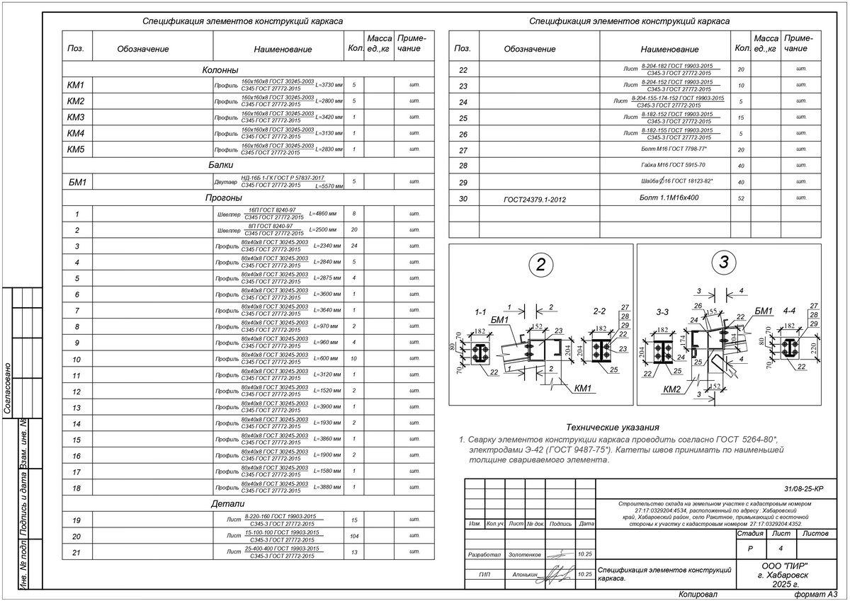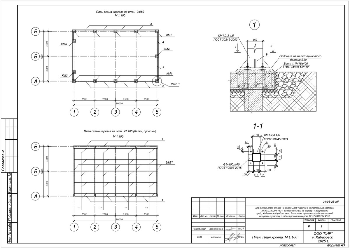 Выполненные работы: разработка проектной документации в объёме раздела КР (шифр 31/08-25-КР), включающего план-схему каркаса, развёртки рам, план свайного поля, план монолитной фундаментной плиты, спецификацию элементов конструкций.