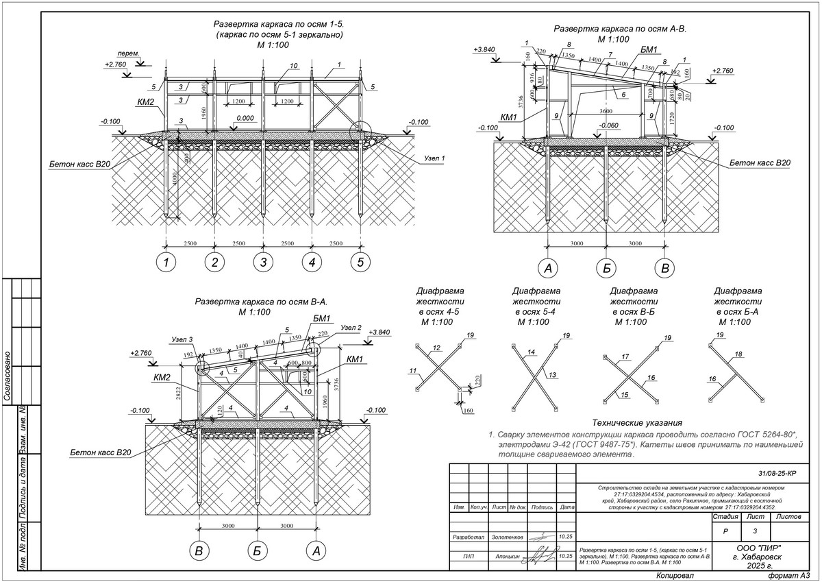 Шаг колонн — 2500 мм по продольным осям (1-5), пролёт балок покрытия — 6000 мм по поперечным осям (А-Б-В). Каркас включает 5 рядов колонн высотой от отм. −0.100 до отм. +2.760, объединённых главными балками и системой прогонов с шагом 1350–1400 мм. Диафрагмы жёсткости установлены в осях 4-5, В-Б и Б-А.