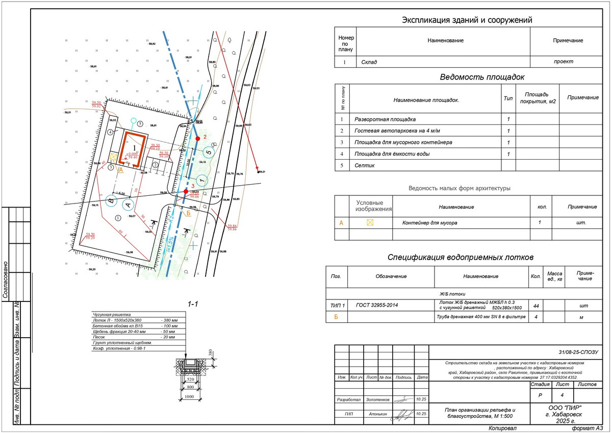 - Лист 4 — План организации рельефа и благоустройства, М 1:500.