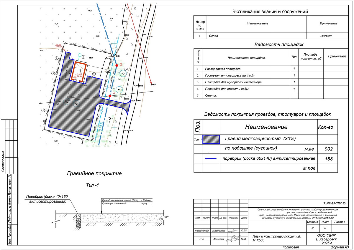 Общая площадь площадок с твёрдым покрытием — 902 м². Тип покрытия (Тип 1) — мелкозернистый гравий (30%) по подсыпке из суглинка, толщина 100 мм, грунт уплотнённый. Поребрик из антисептированной доски 60×140 мм — 188 п. м.